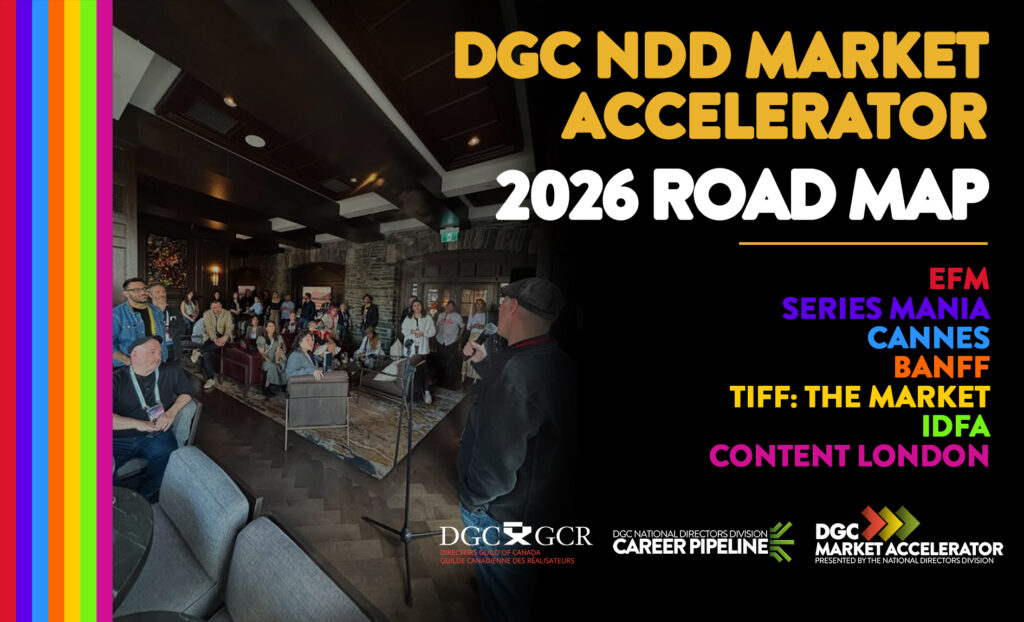 The National Directors Division (NDD) of the Directors Guild of Canada (DGC) Director Market Accelerators were started in 2025 in recognition of the fact that many DGC Director members are not only Directors but also very often the writers and producers on projects for which they hold the IP. The Market Accelerators provide a wide array of benefits and opportunities at specific film festivals and markets internationally and within Canada. Current locations are: EFM (Berlin), Series Mania (Lille, France), Hot Docs (Toronto), International Documentary Film Festival Amsterdam (Amsterdam, Netherlands), Cannes Film Festival, Banff World Media Festival (Banff), Access Canada Summit during TIFF (Toronto), Atlantic International Film Festival Partners (Halifax), Content London. Selected DGC Directors all have active projects they are seeking to move forward with an independent producer attached and at least partial development financing secured. Delegation benefits include: project feedback direct from industry teams; market preparedness consultation sessions; 1:1 pitch and branding training with top industry consultants; private reception; discounted passes; and exclusive curated networking sessions with attending national and international decision makers.