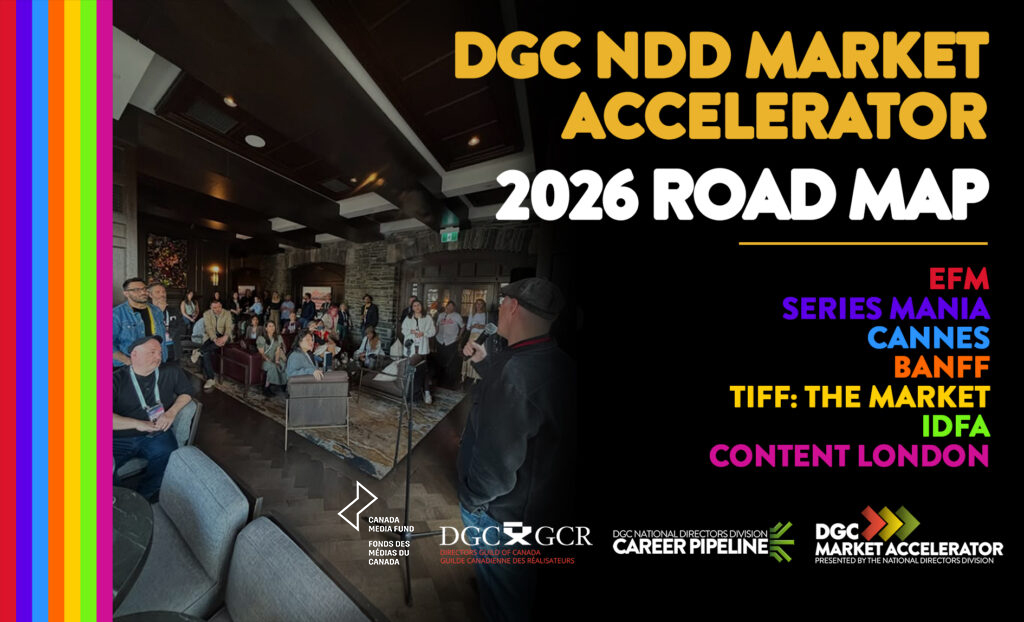 The National Directors Division (NDD) of the Directors Guild of Canada (DGC) Director Market Accelerators were started in 2025 in recognition of the fact that many DGC Director members are not only Directors but also very often the writers and producers on projects for which they hold the IP. The Market Accelerators provide a wide array of benefits and opportunities at specific film festivals and markets internationally and within Canada. Current locations are: European Film Market (Berlin), Series Mania (Lille, France), International Documentary Film Festival Amsterdam (Amsterdam, Netherlands), Cannes Film Festival, Banff World Media Festival (Banff), Toronto International Film Festival: The Market (Toronto), and Content London (London, United Kingdom). Selected DGC Directors all have active projects they are seeking to move forward with an independent producer attached and at least partial development financing secured. Delegation benefits include: project feedback direct from industry teams; market preparedness consultation sessions; 1:1 pitch and branding training with top industry consultants; private reception; discounted passes; and exclusive curated networking sessions with attending national and international decision makers.