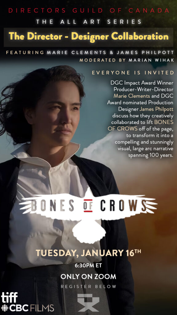 DGC Impact Award Winner Producer-Writer-Director Marie Clements and DGC Award nominated Production Designer James Philpott discuss how they creatively collaborated to lift BONES OF CROWS off of the page, to transform it into a compelling and stunningly visual, large arc narrative spanning 100 years.