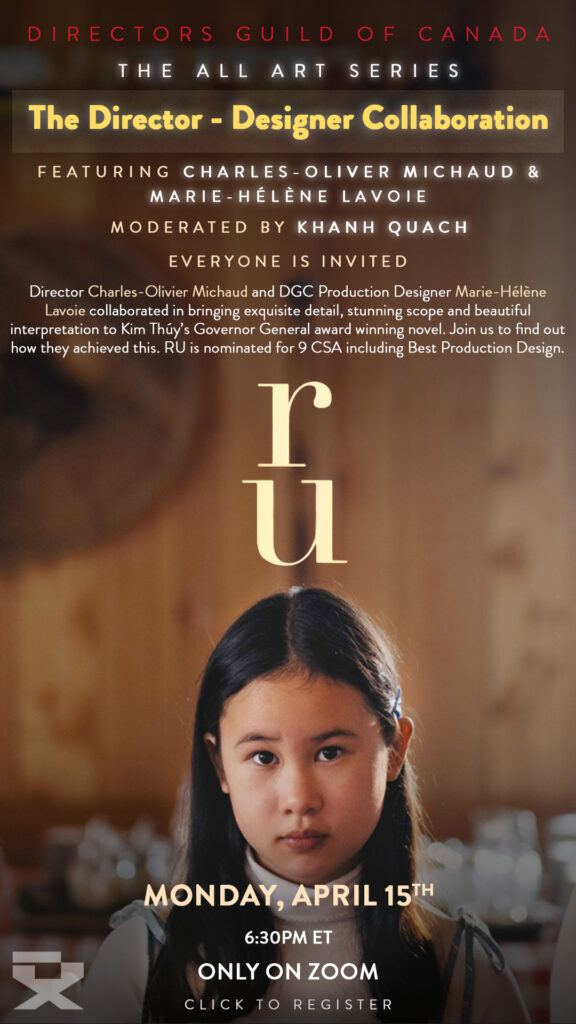 Director Charles-Olivier Michaud and DGC Production Designer Marie-Hélène Lavoie collaborated in bringing exquisite detail, stunning scope and beautiful interpretation to Kim Thúy’s Governor General award winning novel. Join us to find out how they achieved this. RU is nominated for 9 CSA including Best Production Design.