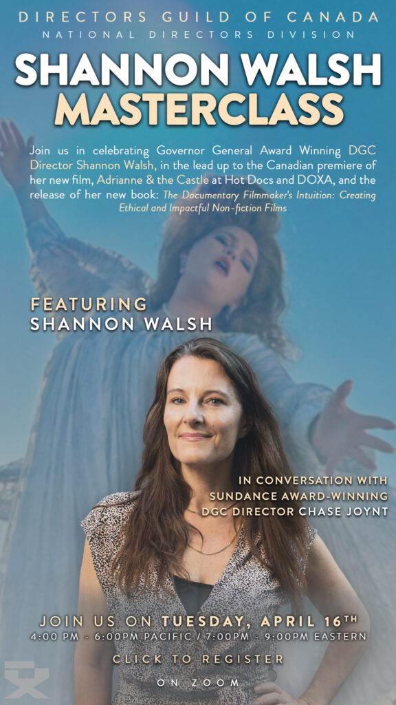 Join us in celebrating Governor General Award Winning DGC Director Shannon Walsh, in the lead up to the Canadian premiere of her new film, Adrianne & the Castle at Hot Docs and DOXA, and the release of her new book: The Documentary Filmmaker’s Intuition: Creating Ethical and Impactful Non-fiction Films. Moderated by Chase Joynt