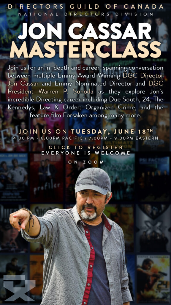Join us for an in-depth and career-spanning conversation between multiple Emmy Award Winning DGC Director Jon Cassar and Emmy Nominated Director and DGC President Warren P. Sonoda as they explore Jon’s incredible Directing career including Due South, 24, The Kennedys, Law & Order: Organized Crime, and the feature film Forsaken among many more.